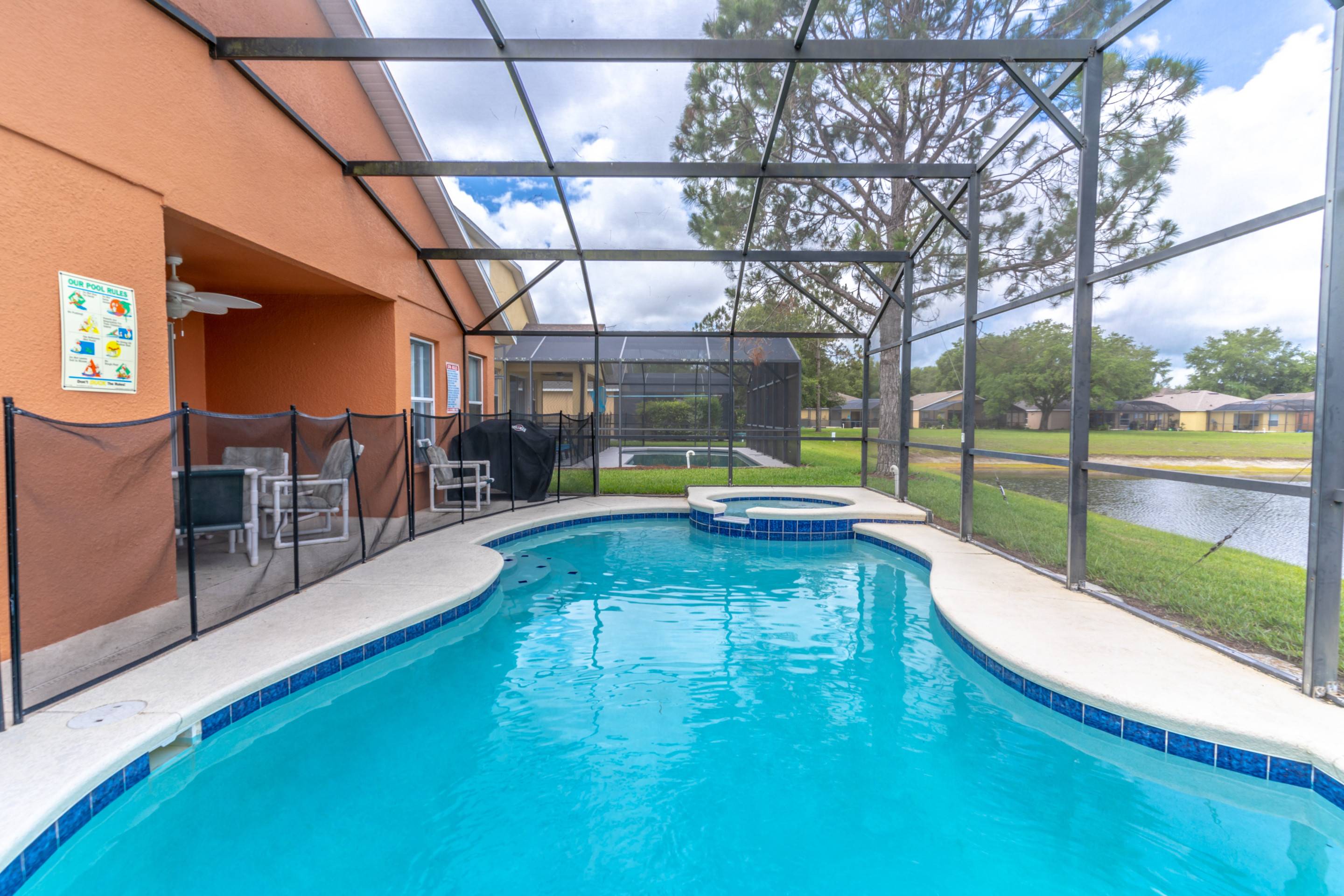 Welcome to your dream vacation home! This beautiful property offers a single-story layout with 5 bedrooms and 3 bathrooms, including a private pool and spa with a stunning lake view and sunset. The living room features a large sectional sofa and a flat-screen TV with cable viewing. The spacious kitchen is fully equipped with all major appliances, cookware, and dinnerware. After a day of exploring the parks and attractions, relax in the oversize pool and spa while watching the sunset.