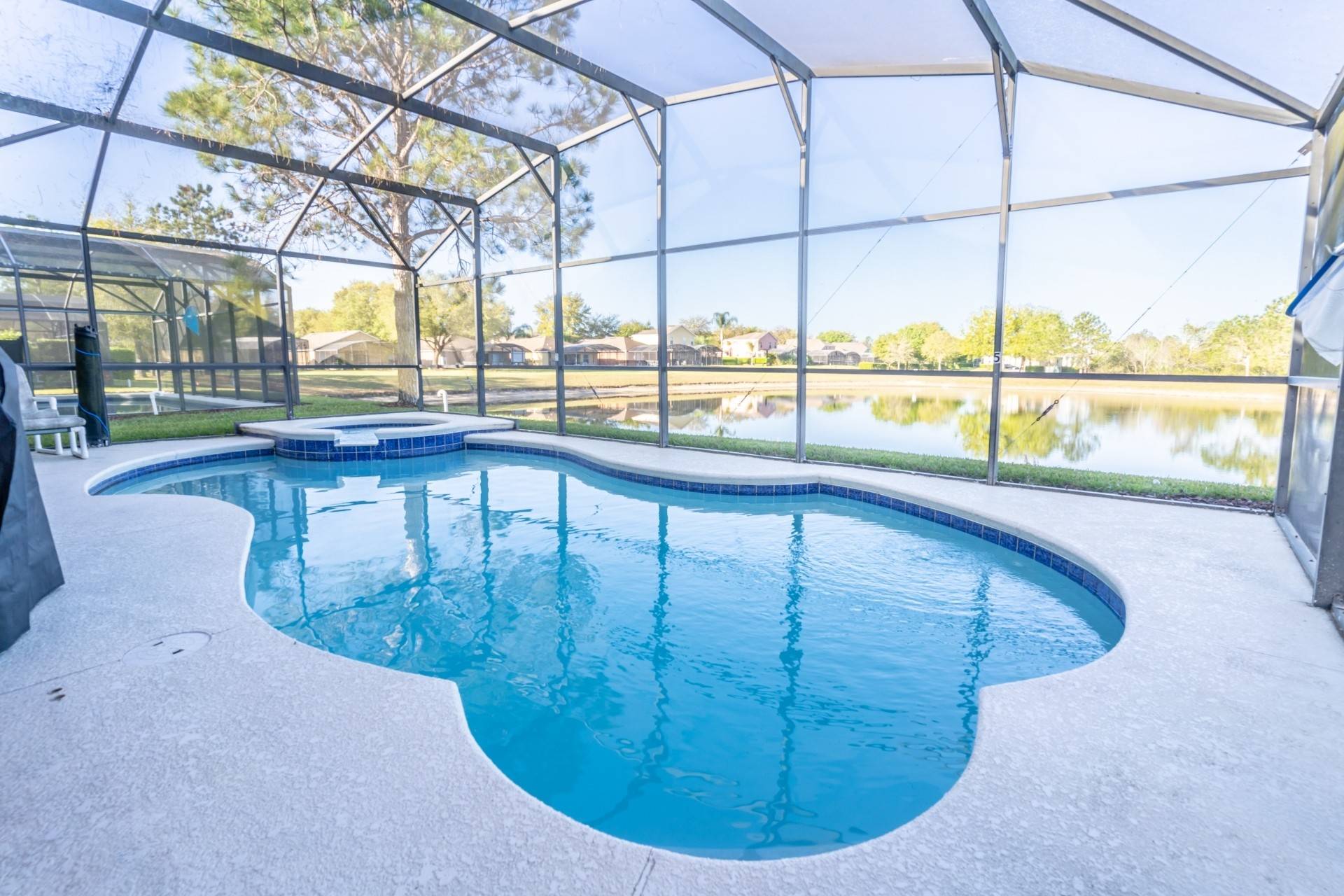 - Open floor plan with pool and lake views